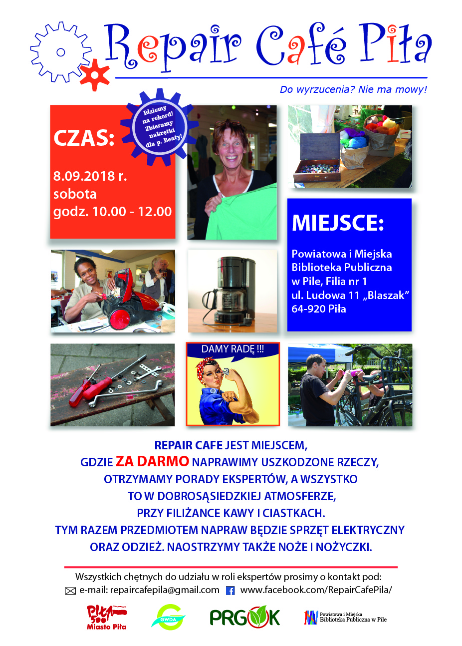 Po wakacyjnej przerwie wraca Repair Cafe Piła. W najbliższą sobotę 8 września nasi fachowcy będą naprawiać uszkodzone przedmioty w bibliotece przy ul. Ludowej 11 (blaszak).