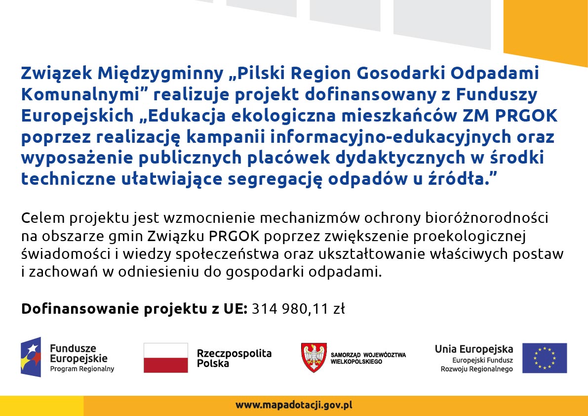 W piątek 28 września 2018r. w siedzibie Urzędu Marszałkowskiego Województwa Wielkopolskiego w Poznaniu Związek Międzygminny „PRGOK” podpisał umowę o dofinansowanie projektu pn. „Edukacja ekologiczna mieszkańców gmin ZM PRGOK poprzez realizację kampanii informacyjno-edukacyjnych oraz wyposażenie publicznych placówek dydaktycznych w środki techniczne ułatwiające segregacje odpadów u źródła”.