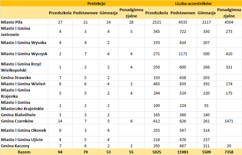 Zestawienie ilości przeprowadzonych prelekcji i liczby uczestników w poszczególnych gminach